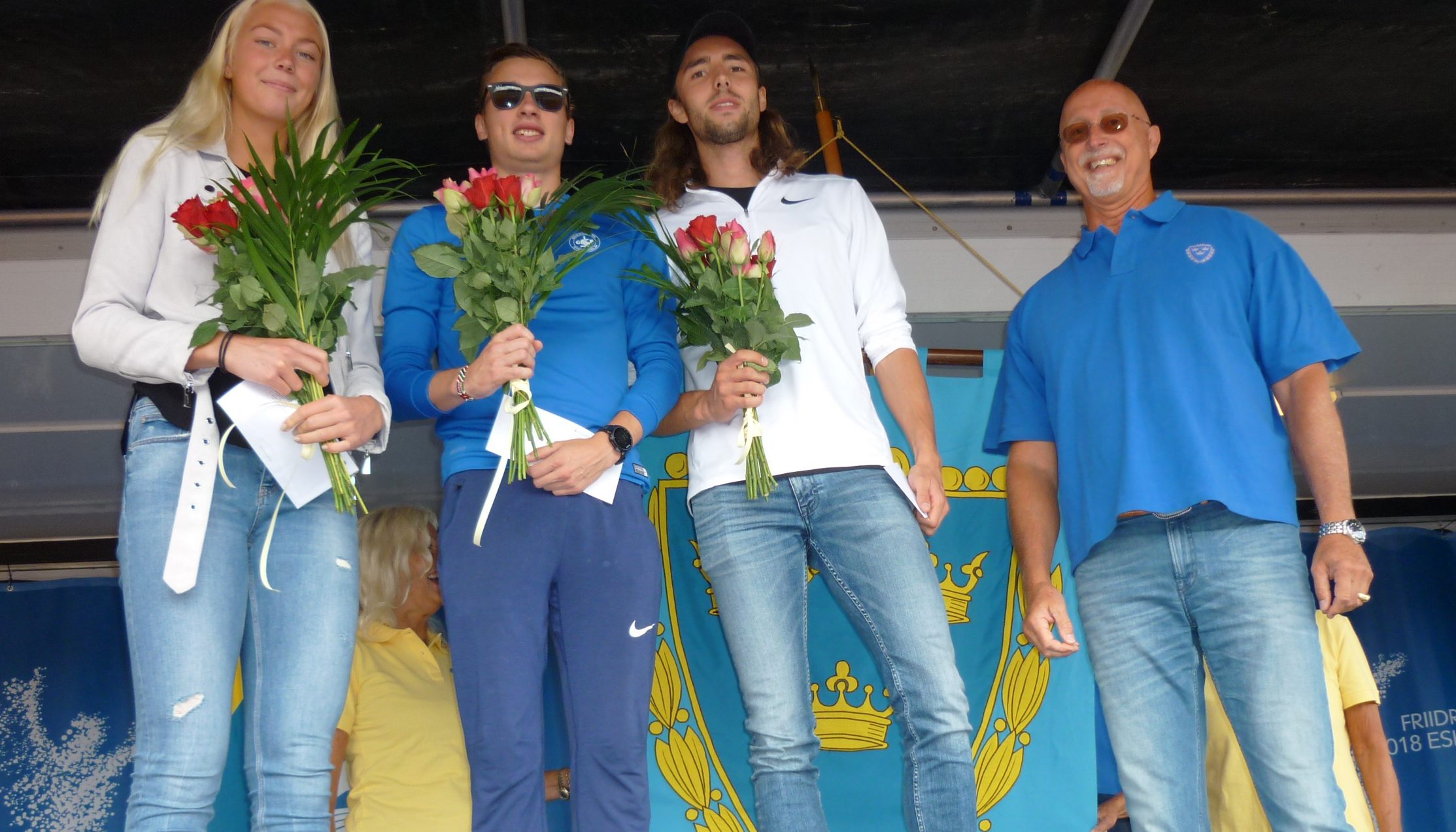 Maja Nilsson, Kalle Berglund och Andreas Kramer får sina stipendier på 10 000 kr vardera vid en ceremoni under SM i Eskilstuna. Prisutdelare är Rajne Söderberg, ordförande i Friidrottens Stora Grabbar & Tjejer.
